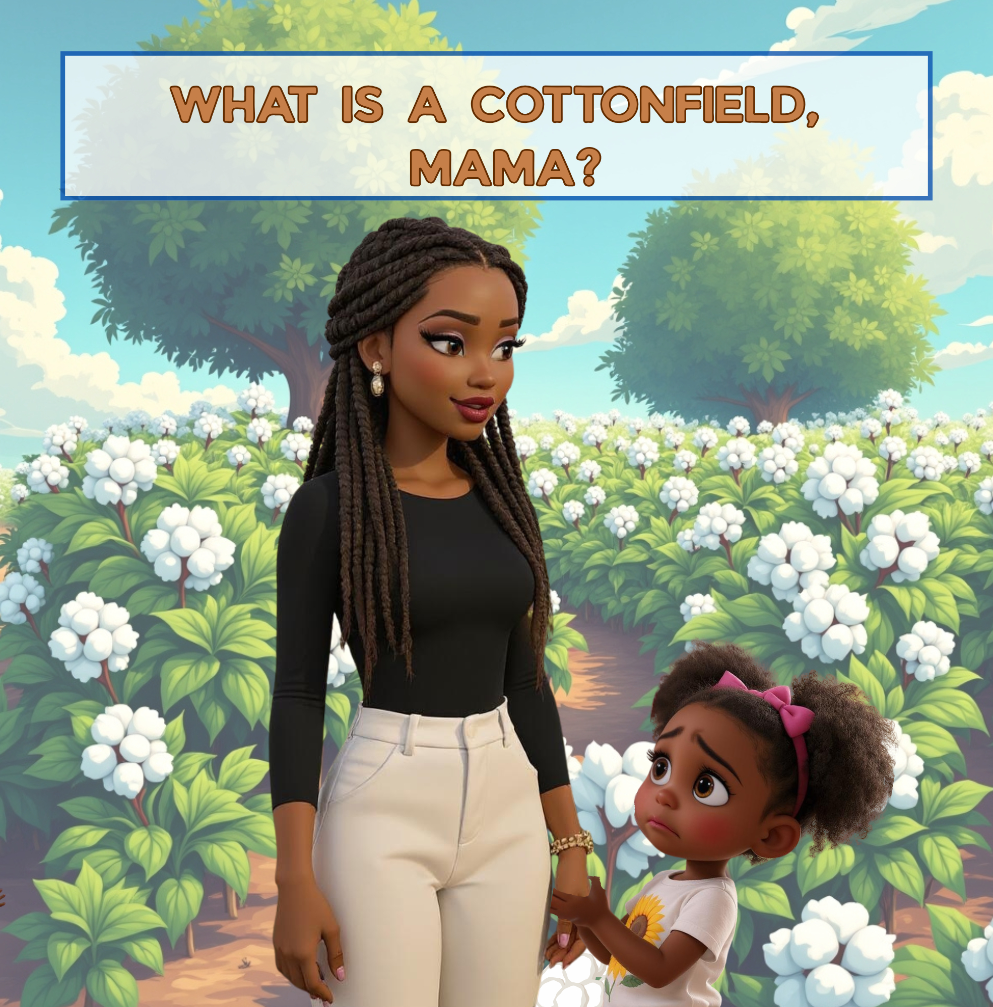 The cover of What Is a Cottonfield, Mama? depicts cotton fields stretching across the background—a reminder of the humble beginnings of many who labored without freedom, picking cotton as enslaved people. Yet, it also symbolizes the enduring strength passed down through generations. From those fields of hardship grew the resilience, pride, and hope that continue to inspire future generations to rise and create a brighter tomorrow.